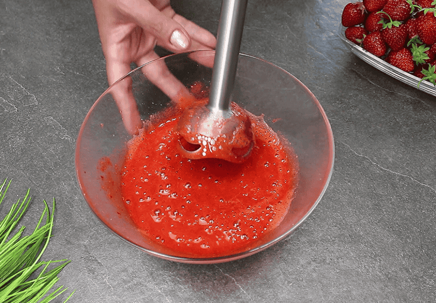 Полуницю промиваю, просушую і відправляю у глибоку миску. Додаю цукор і за допомогою блендера добре подрібнюю.