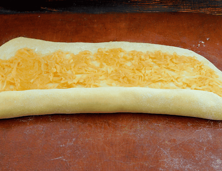 Тісто поділити на дві частини. Розкачати в пласт 3-4 мм завтовшки. Розподілити половину яблучної начинки.