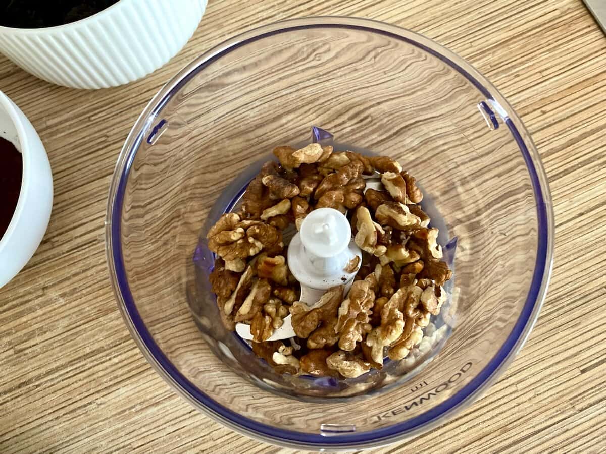 Горіхи перекласти в ємність для подрібнення і пробити до стану дрібної крихти.