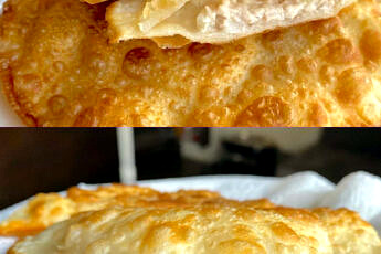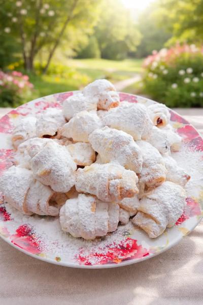 Борошно перетерти зі смальцем. Додати сметану, замісити тісто. Розділити тісто на дві частини. Одну частину розкачати у пласт, розділити на 24 сегменти. Викласти начинку (вишні, джем) скрутити рулетиком. Випікати при 180° хвилин 15. Гарячі обсипати цукровою пудрою. Якщо робити зі смальцем – будуть дуже крихкі, якщо з маргарином – будуть нагадувати слойоні.