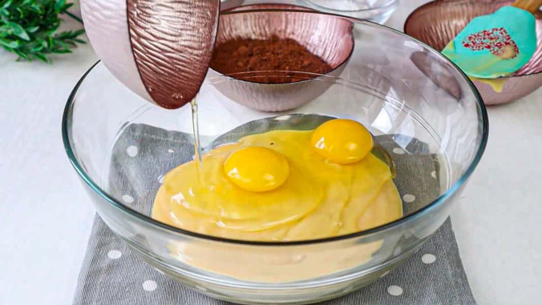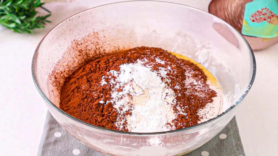Далі додаємо борошно 130 г, какао 30 г, розпушувач 2 ч. л. і перемішуємо.
