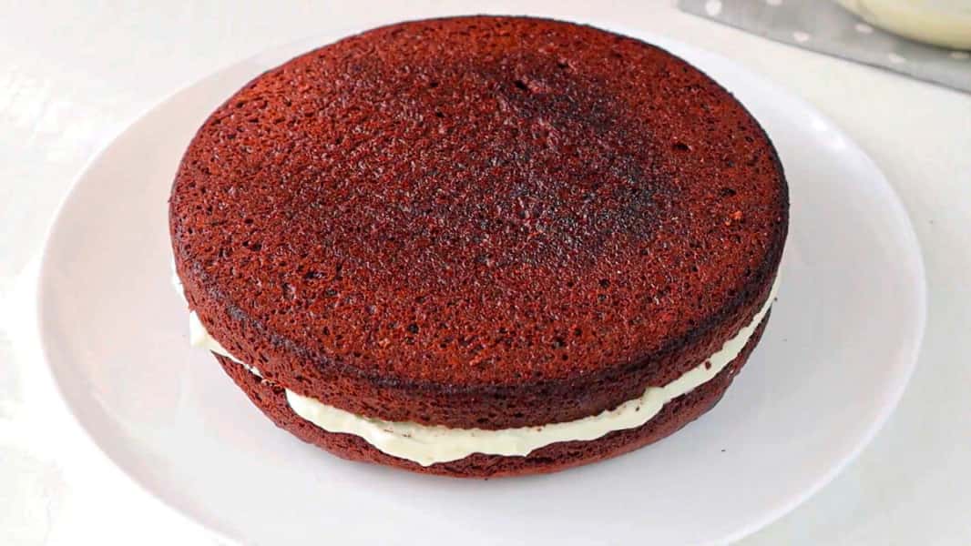 На корж викладаємо половину крему і закриваємо другим коржем.
