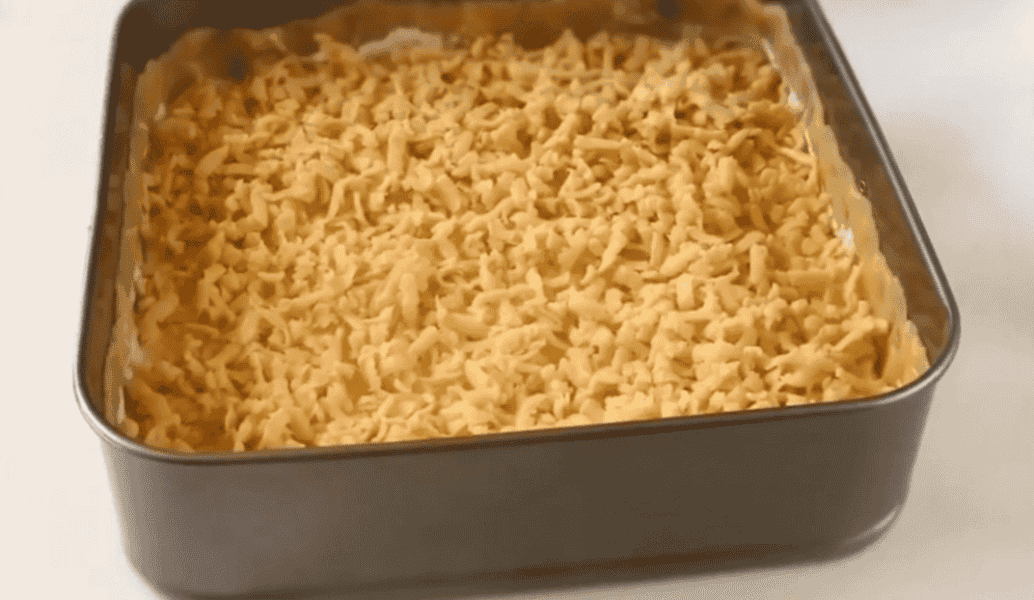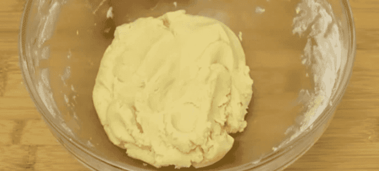 Замішуємо тісто, яке не липне до рук. Розрізаємо його на 2 частини (одна трохи більше за іншу) і відправляємо більшу частину в холодильник на 30 хвилин, а іншу частину в морозилку, щоб воно добре замерзло, щоб потім можна було натерти на тертці.