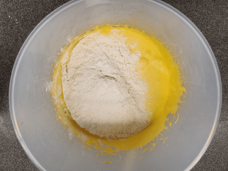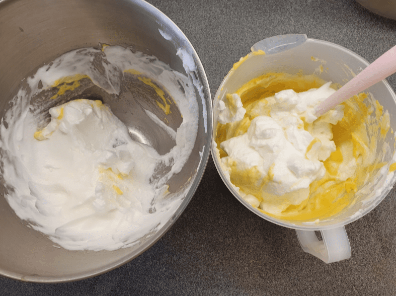 У жовтки додаємо борошно, трохи білків, щоб полегшити масу та замішуємо тісто, поступово додаючи білки.