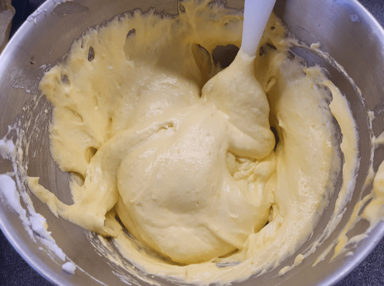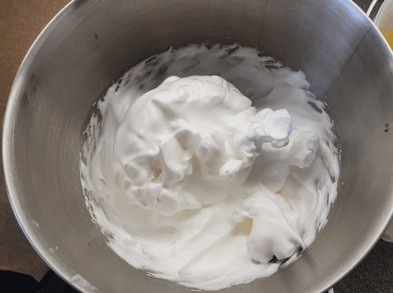 Приблизно в 3 заходи додати всі білки. Перемішувати акуратно, піднімаючи лопатку з дна, щоб білки не осіли.