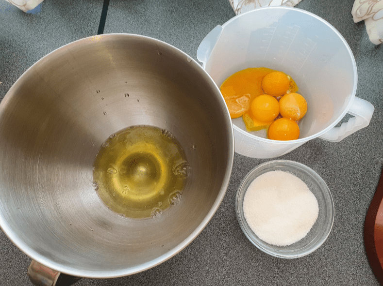 Половину цукру (50 гр.) кладемо в білки і 50 гр. у жовтки. Білки збиваємо до щільних піків.