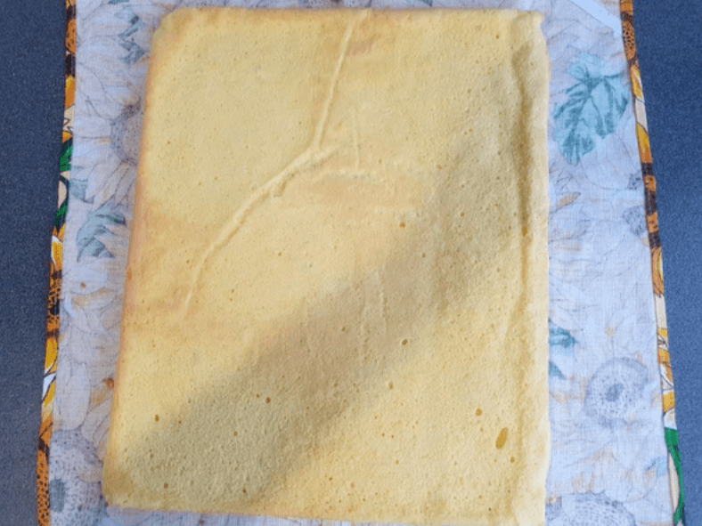 Переверніть лицьовою стороною бісквіт на рушник і зніміть пергамент. Якщо пергамент не відстає від бісквіту, то змочіть його трохи мокрою рукою. І тоді він зніметься швидко та добре.