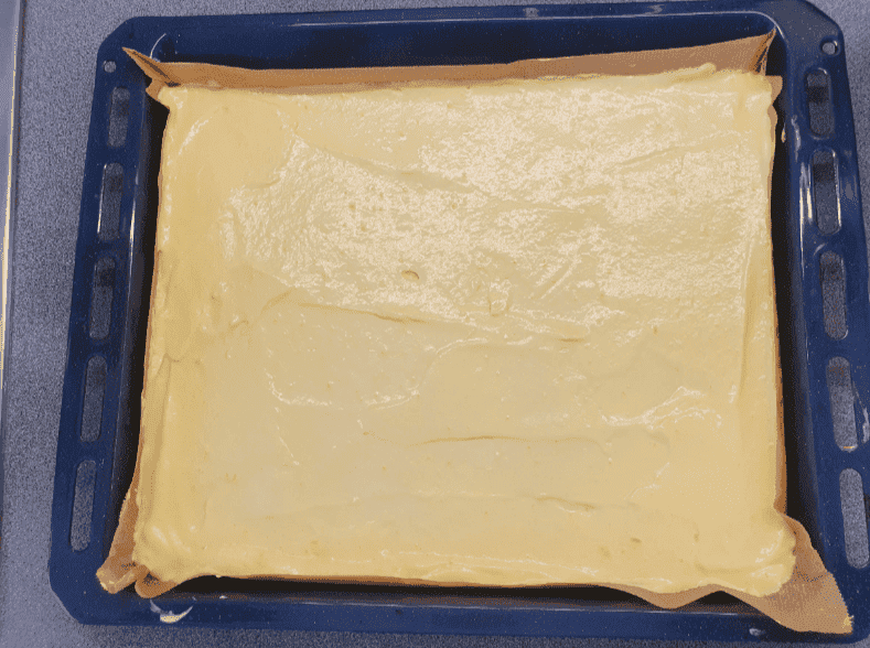 На деко вистелити пергамент і загнути борти, щоб тісто не витекло. Розподіляємо тісто по пергаменту рівномірно, заповнюючи кути.