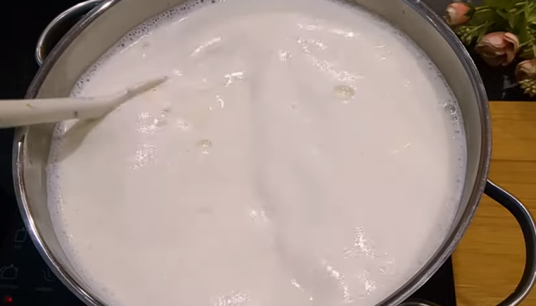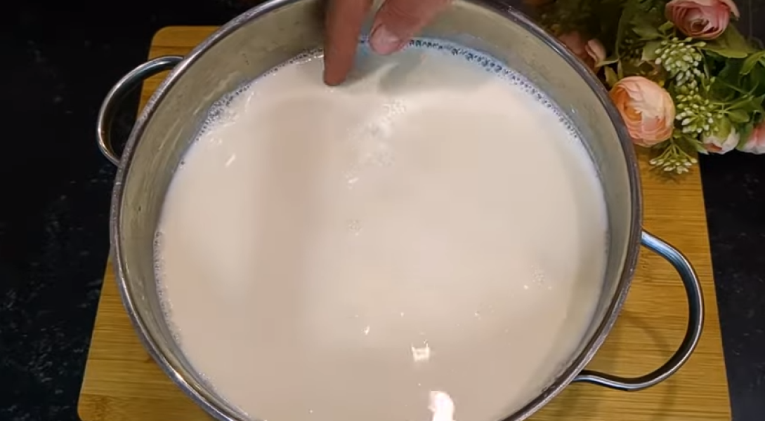 1. У каструлю на плиті наливаю молоко, маю домашнє. Доводимо молоко до кипіння, періодично перемішуємо, гасячи піну. Відбувається випаровування та концентрація білка збільшується. Якщо молоко магазинне, до кипіння можна не доводити. Знімаємо каструлю з плити і залишаємо остигати.