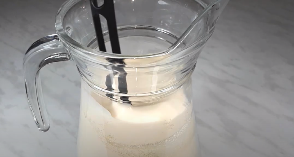 Беремо ряжанку – 750 мл і всипаємо в неї півсклянки цукру. Перемішуємо та залишаємо на 10 хвилин, до розчинення цукру.
