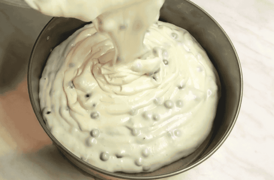 Добре все перемішую та переливаю тісто у форму. Діаметр моєї форми 24 см. Забираю форму з тістом у добре розігріту духовку.