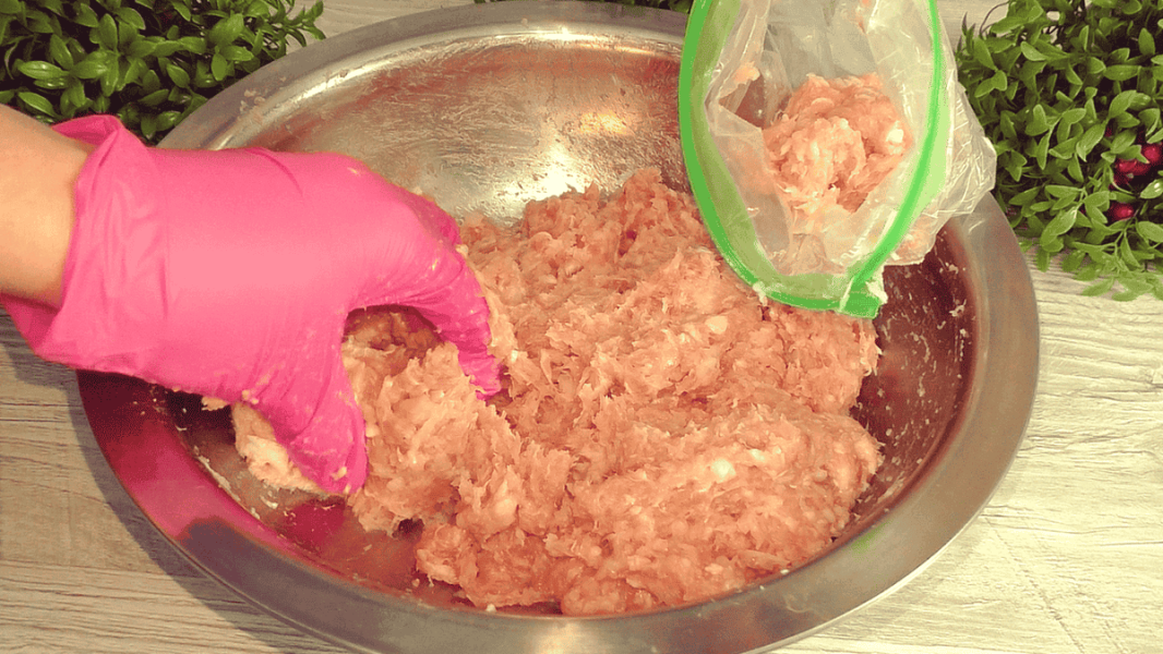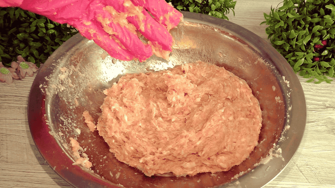 Можна брати кулю м’яса і кидати її назад в миску. Відбивати до появи білкових ниток.