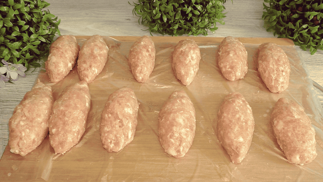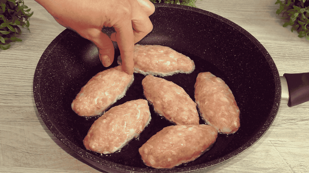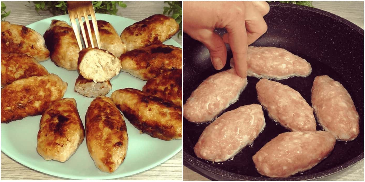 Формую котлети плоскої довгастої форми. Ні борошном, ні сухарями не користуюся, просто змочую руки холодною водою.