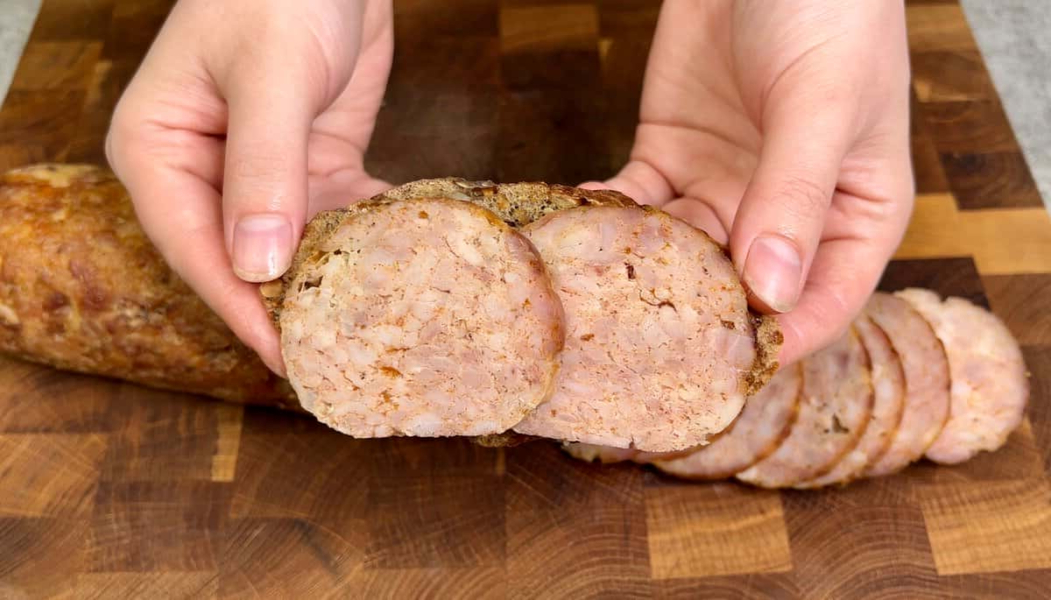 Це один з наших улюблених сімейних рецептів. Все максимально просто, швидко і без всяких проблем. А результат при всій простоті завжди чудовий! Така ковбаса хороша на будь-який випадок: до сніданку, на перекус, і, навіть, як святкова нарізочка!