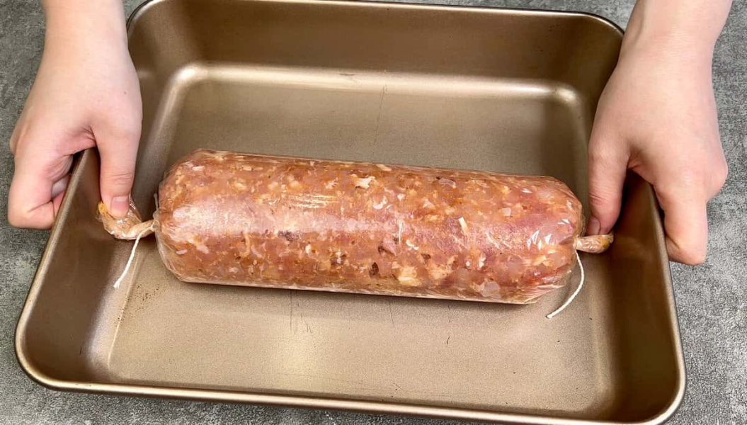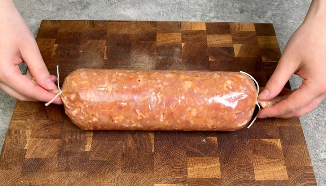 5. Викладаємо фарш на розрізаний рукав для запікання, надаємо форму ковбаси і зав’язуємо “цукерку” шпагатом з двох сторін.