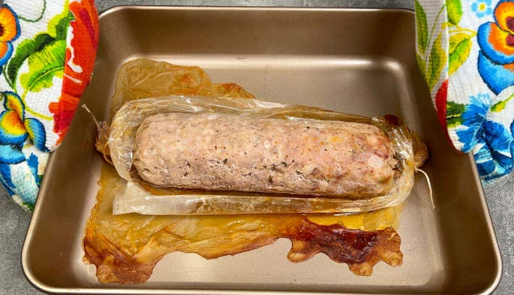 6. Перекладаємо ковбасу на деко і відправляємо в розігріту до 180 градусів духовку рівно на 1 годину.