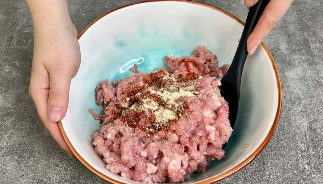3. М’ясо від стегенець пропускаємо через м’ясорубку, додаємо солодку паприку, мелений коріандр, сушений часник, сіль, чорний мелений перець і гарненько все перемішуємо.