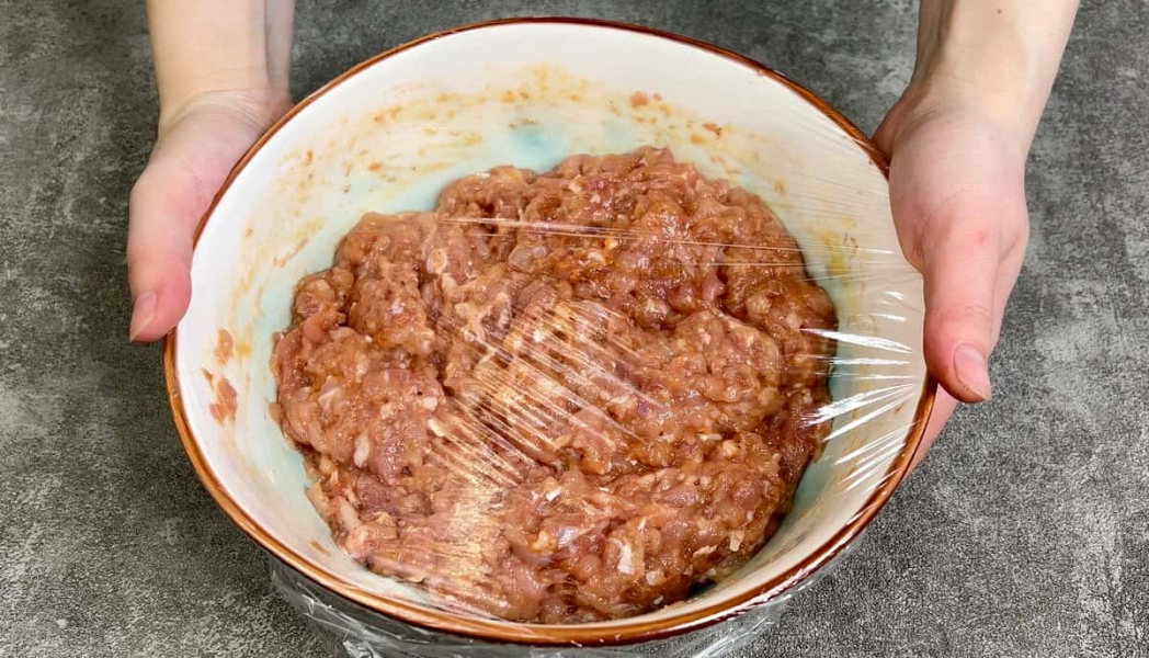 4. До фаршу вливаємо остиглий бульйон, ще раз ретельно все перемішуємо, накриваємо харчовою плівкою і прибираємо в холодильник на 6-8 годин.