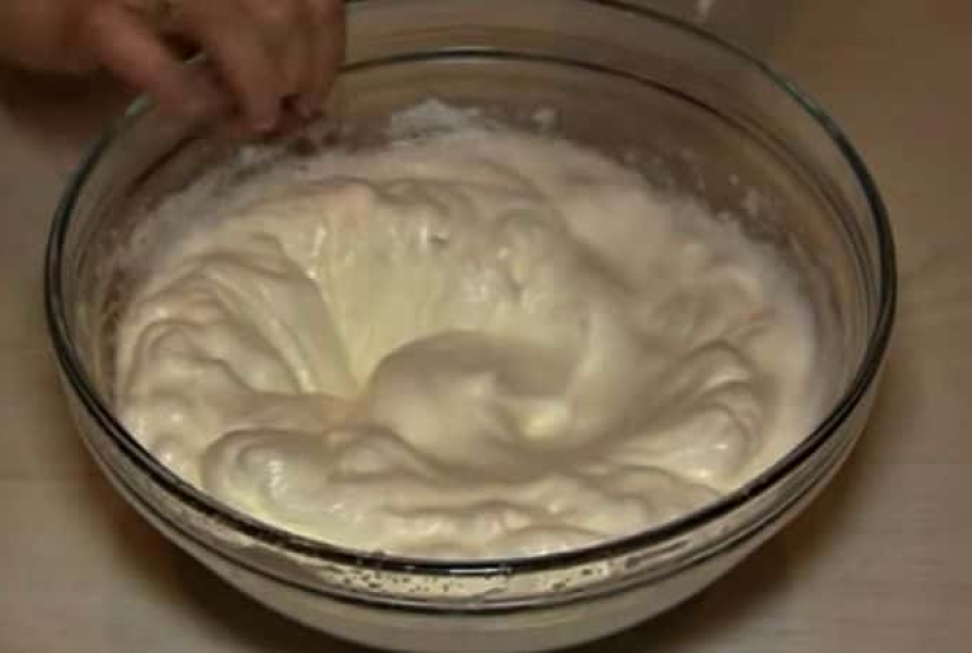 Збийте міксером охолоджені білки до стану густої піни. Введіть їх в тісто.