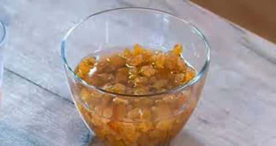 Залийте родзинки окропом і залиште на 15 хвилин. Потім злийте воду і промокніть паперовим рушником. Якщо любите аромат цитрусових, то додайте натерту цедру.