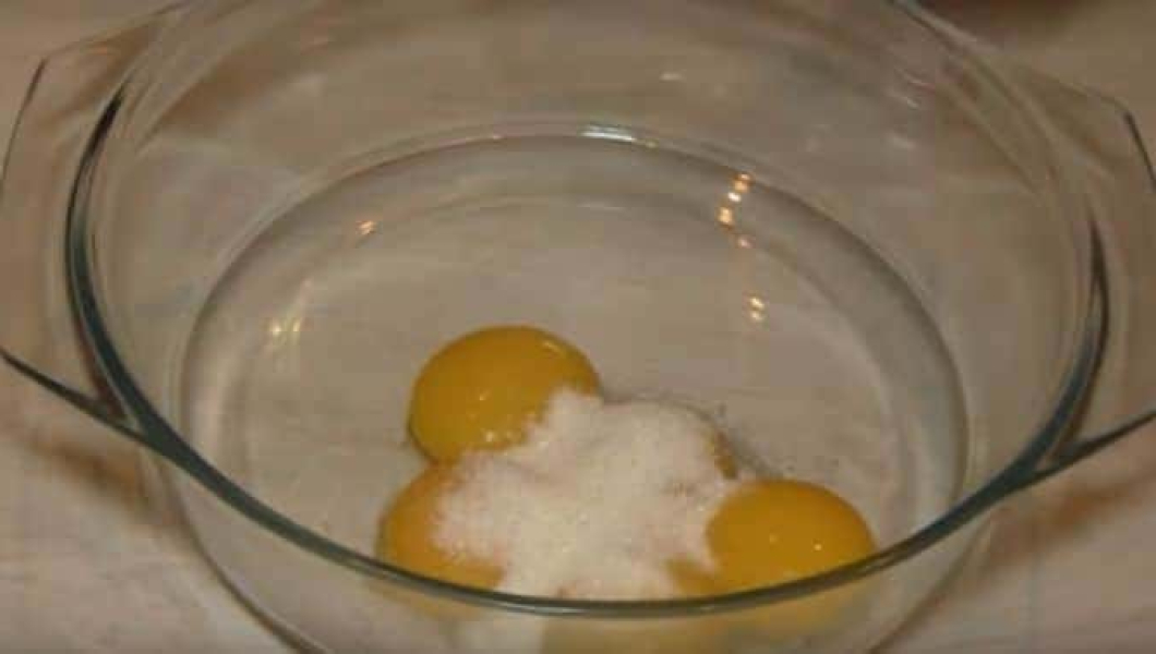 Відокремте акуратно жовтки від білків. Перетріть жовтки з цукром, що залишився, всипте ваніль і змішайте із загальною масою.