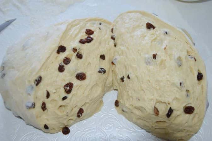 Коли тісто піднялося в 2 рази, його потрібно обминути. Потім додати родзинки і знову вимісити до однорідного стану. Нехай ще один раз підніметься.