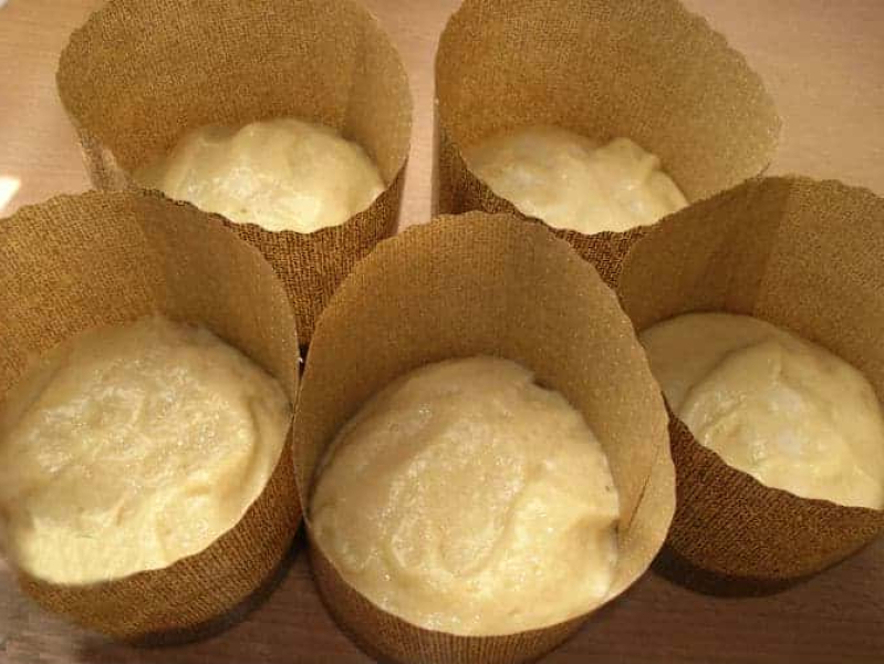 Тепер приступайте до заповнення форм. Сформуйте кульки такого обсягу, щоб форми були заповнені на 1/2 або трохи менше. Тісто має підрости практично до верху формочки. Увімкніть духовку, щоб розігрілася.