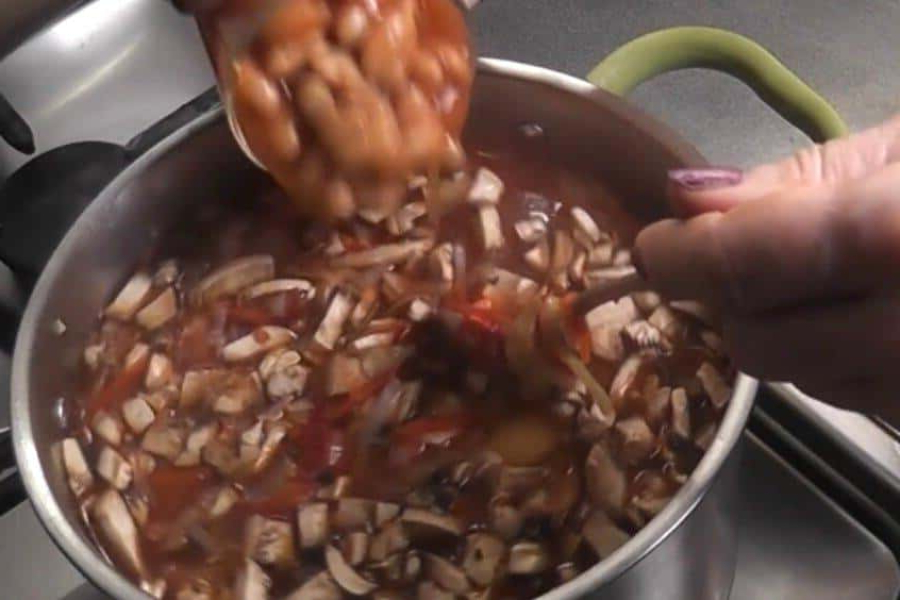 Додаємо консервовану квасолю. Варимо ще рівно 10 хвилин. На цьому етапі борщ треба посолити і додати спеції ( лавровий лист, спеції для борщу ).