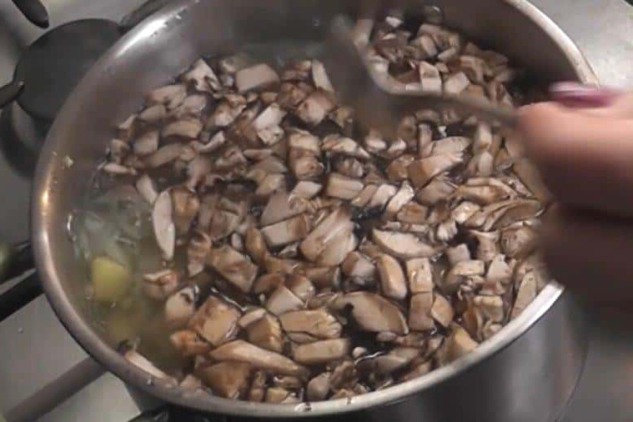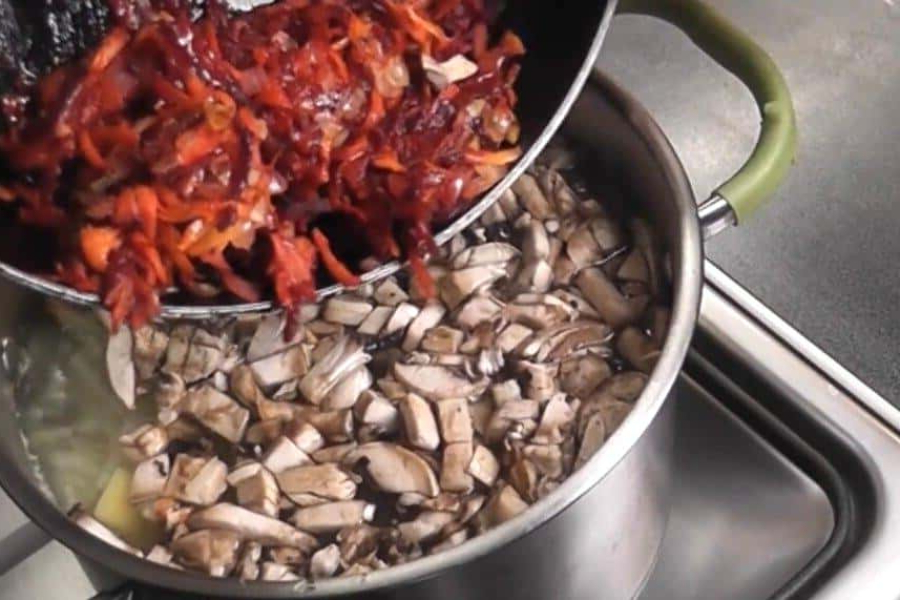 Потім додаємо дрібно нарізані гриби і картоплю. Все добре перемішуємо і варимо 20 хвилин.