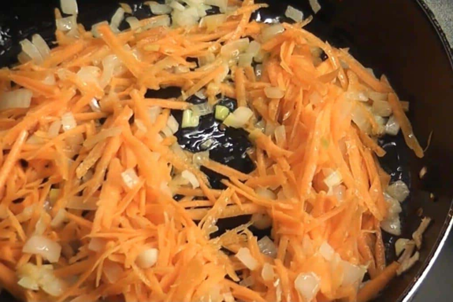 Як тільки цибуля придбає золотистий колір, додаємо моркву. Все добре перемішуємо і тушкуємо овочі до напівготовності.