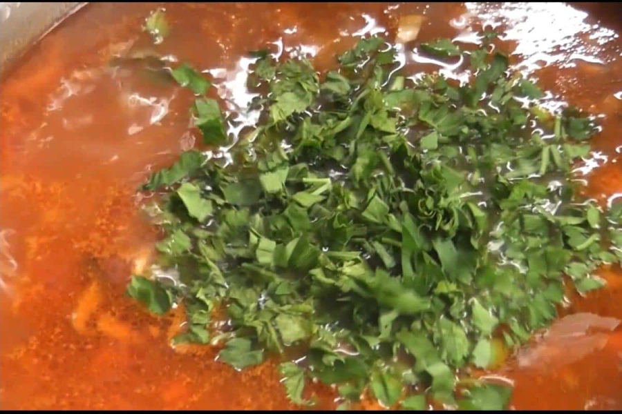 Як тільки всі овочі добре зваряться і борщ придбає рівномірний наваристий червоний колір, додаємо дрібно нарізану зелень. Перемішуємо, вимикаємо вогонь і даємо час, щоб борщ настоявся.