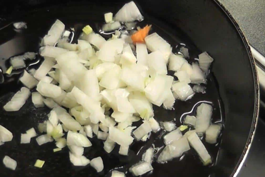 Спочатку обсмажуємо ріпчасту цибулю на сковорідці з додаванням олії.