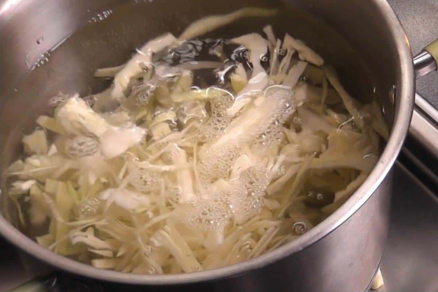 У киплячу воду кидаємо нашатковану капусту. Як тільки вода закипить повторно, варимо капусту 5 хвилин.