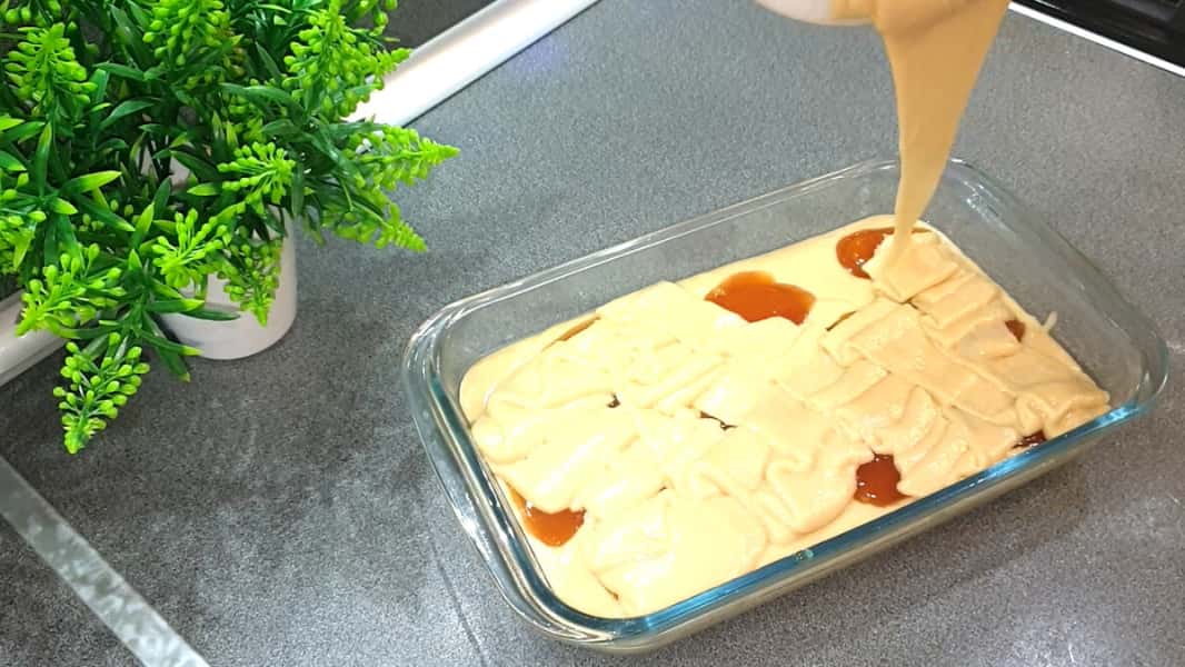 Зверху виливаю, тісто, що залишилося. Духовку розігріваю до температури 180 градусів і випікати буду на середньому рівні в духовці хвилин 35 при цій же температурі.