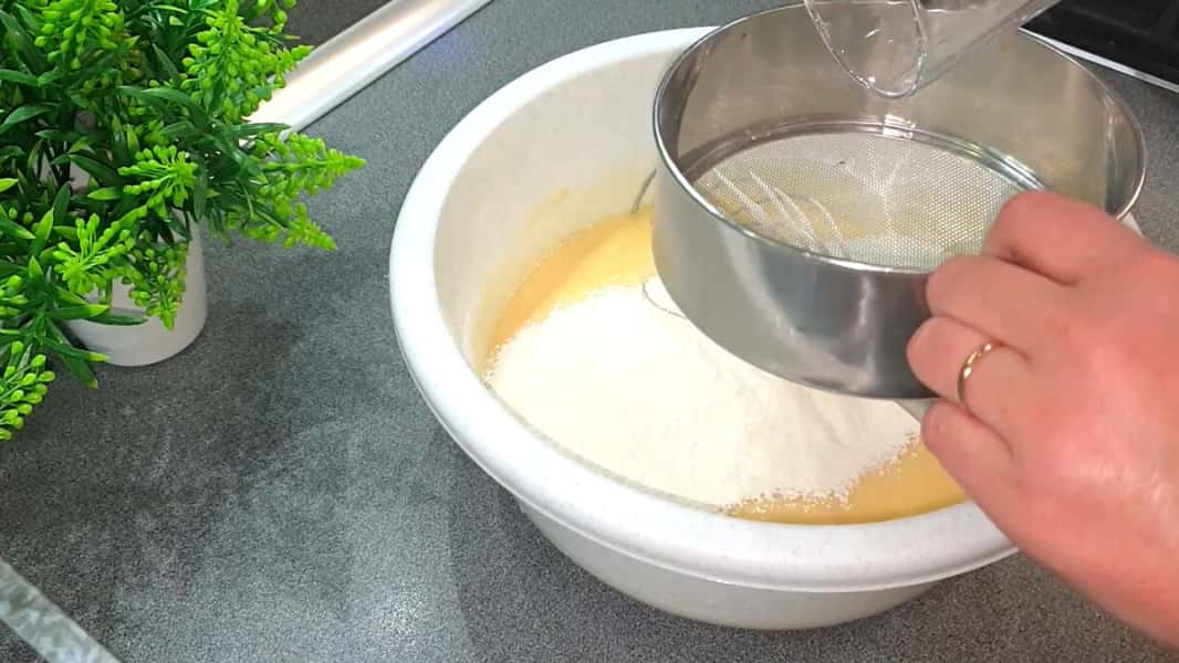 Борошно все відразу не сиплю в тісто, а поступово його додаю і перемішую.