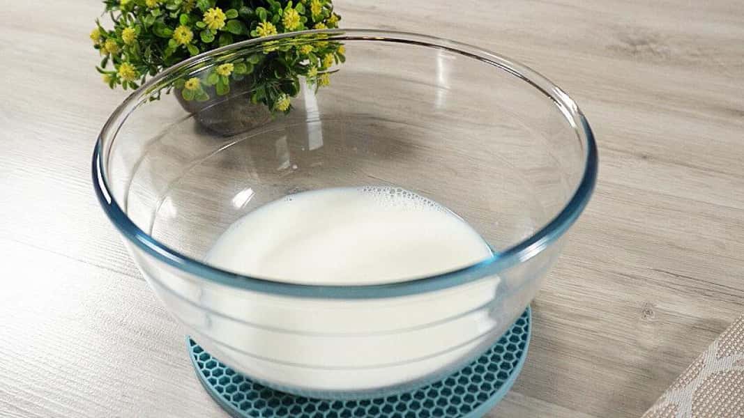 - Додаємо в чашку теплого молока. Висипаємо цукор і сухі дріжджі.