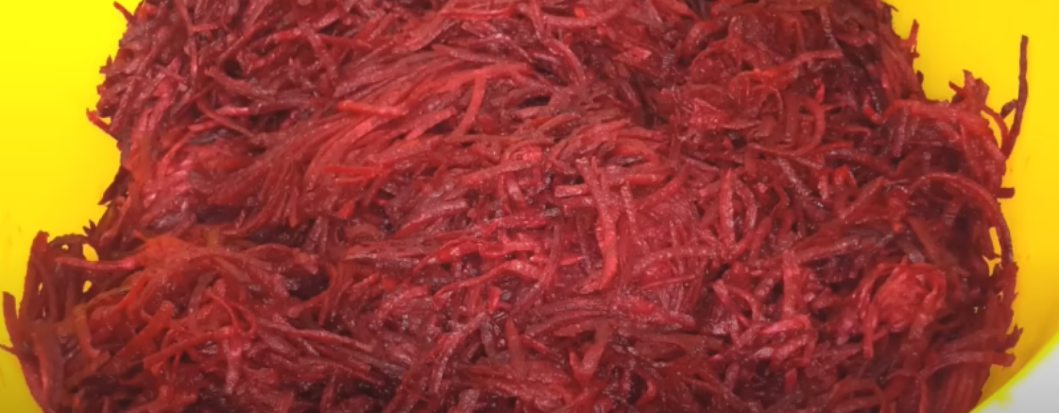 4 кг очищеного (сирого) буряка натираємо за допомогою комбайна або вручну на звичайній терці з великими осередками.