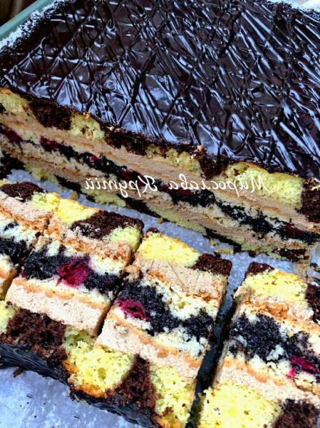 Тісто розділити на 2 частини. В першу додати кокао, в другу 2 ст л борошна. Тісто помістити у кондитерські мішки або в пакети і зробити отвори, щоб тісто у форму викладати смужками. Випікати при 170 гр 25-30хв.Охолоджений корж помістити у плівку і в холодильник на ніч.