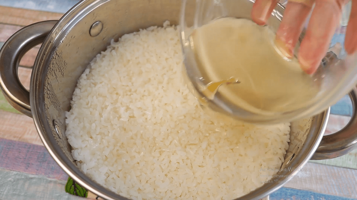 Каструлю знімаємо з плити і прибираємо рушник. Гарячий рис заливаємо заправкою і перемішуємо від країв до центру. Робимо це акуратно, щоб не пошкодити крупинки рису.