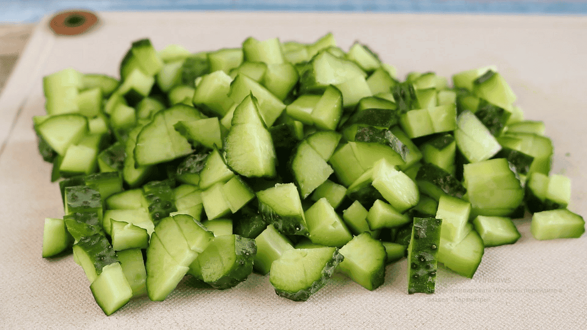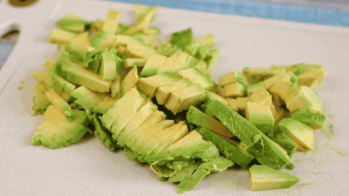 Для начинки 4 середніх огірка ріжемо невеликим кубиком. Якщо всередині є насіння, ми їх видаляємо. Одне велике авокадо розрізаємо навпіл, видаляємо шкірку і ложкою відокремлюємо м’якоть від шкірки. Авокадо також нарізаємо невеликим кубиком. Щоб авокадо не потемніло збризкувалися його лимонним соком і перемішуємо.
