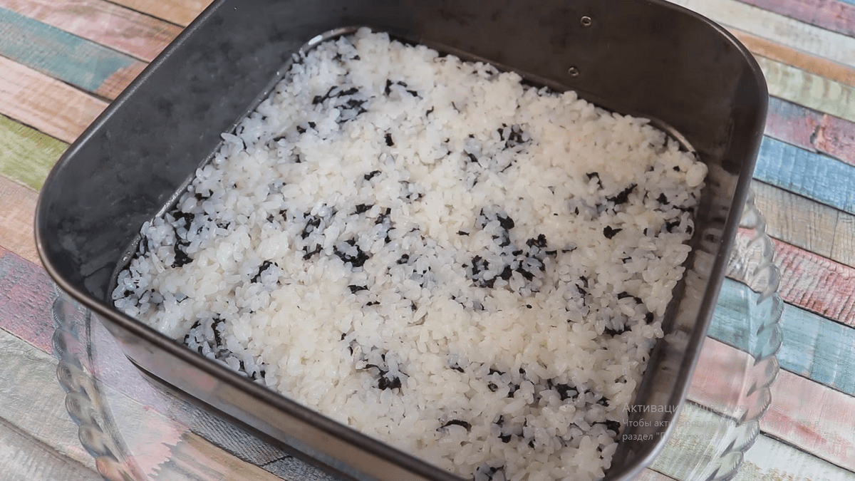 Боки роз’ємної квадратної форми ( 20 * 20 см ) змащуємо раф. олією. Викладаємо рис з норі. Ущільнюємо руками змоченими у воді.