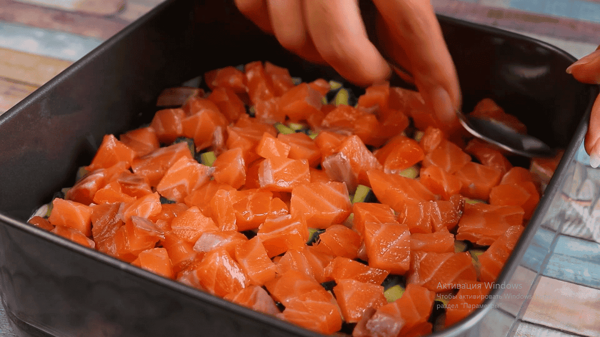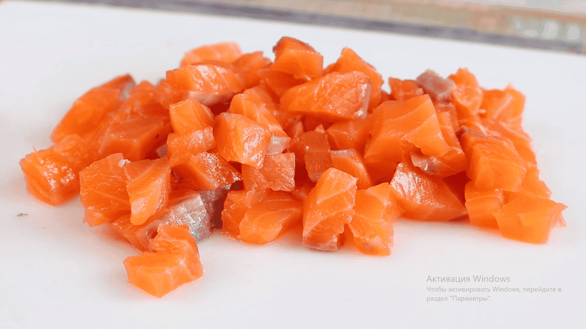 250-300 г червоної малосольної риби також нарізаємо кубиком.