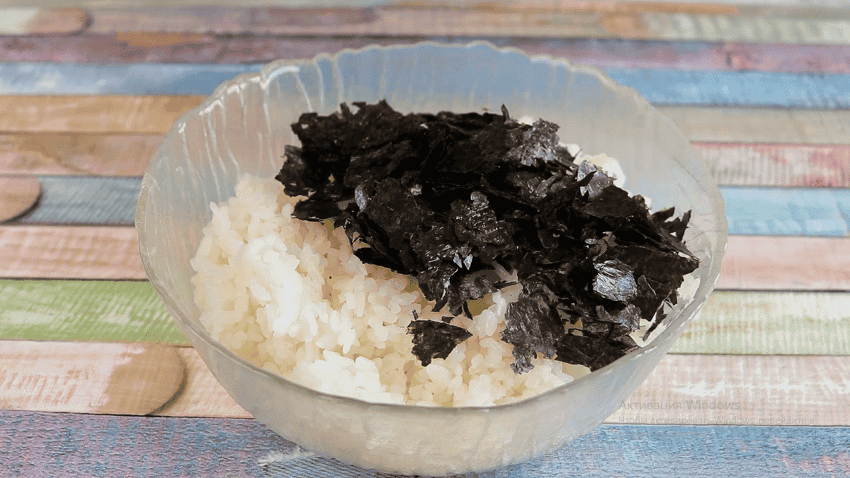 У 1-ю порцію рису додаємо подрібнений лист норі. Перемішуємо.