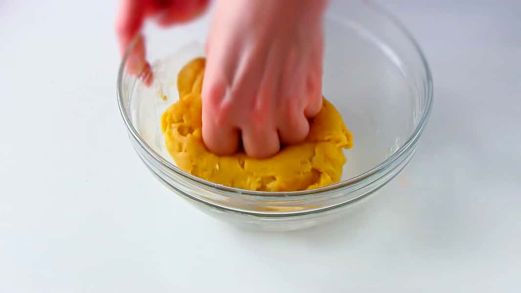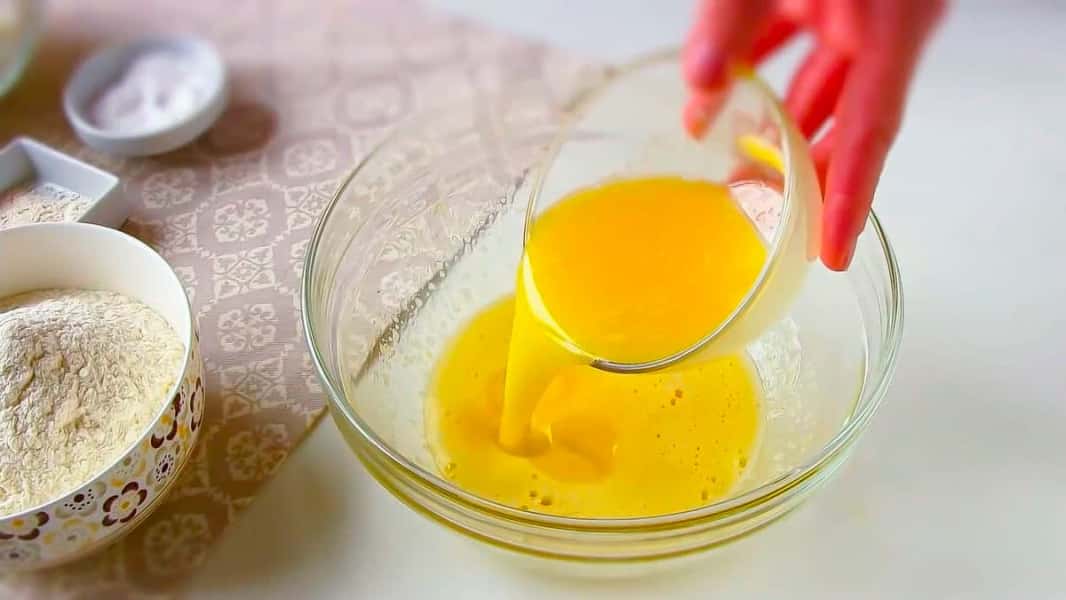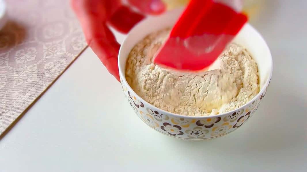 До борошна 220 г додаємо 1 ч. л. розпушувача і перемішуємо. Всипаємо борошно до яєчної маси і замішуємо тісто.