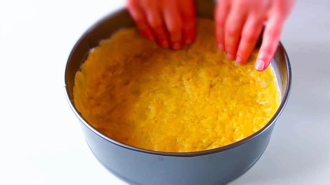 Змащуємо вершковим маслом форму ( 22 см ), викладаємо тісто і розділимо руками за формою. Відправляємо форму з тістом в холодильник на 15-20 хвилин.