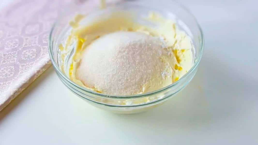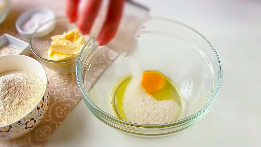 У миску додаємо 1 яйце, 50 г цукру, розтоплене масло вершкове 100 г і перемішуємо.