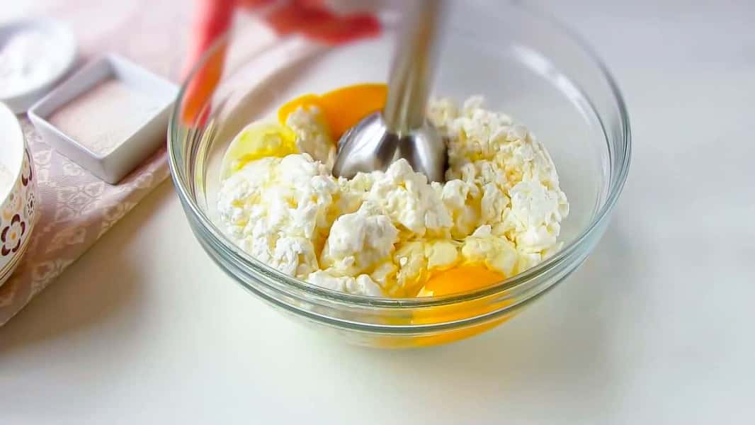 До сиру 500 г додаємо яйця 2 шт. і перемішуємо за допомогою блендера.