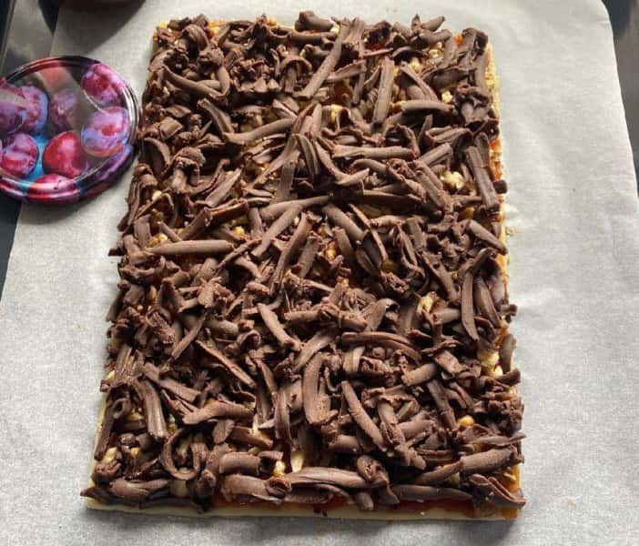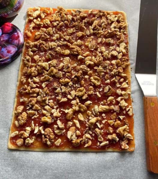 - Тісто змастити повидлом, викласти рубані горіхи.
