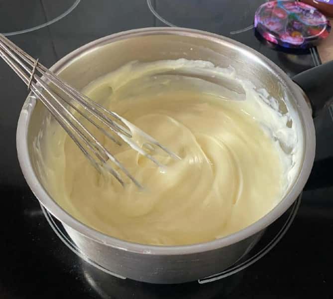 - У каструльку насипати крохмаль, додати вершки, розмішати, щоб не було грудочок, додати згущене молоко. Поставити на середній вогонь та варити до загустіння при постійному помішуванні.