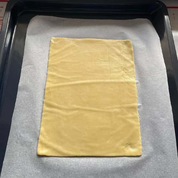 - Дістати з холодильника шматочок світлого тіста, на папері для випічки розкотити прямокутний пласт шириною 2-3 мм.